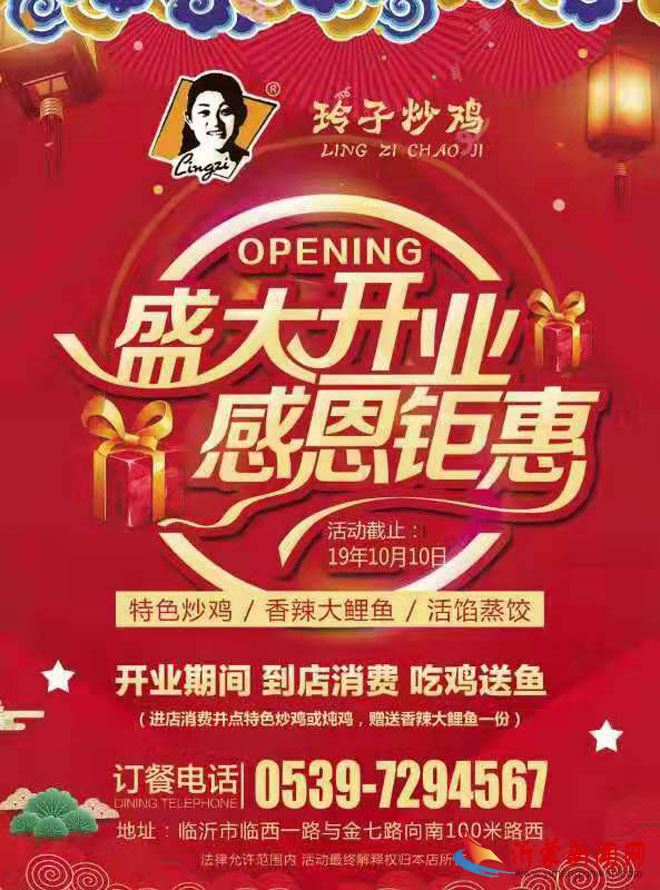 玲子炒鸡(罗庄店)感恩钜惠:从即日起到2019年10月10日,进店消费炒鸡或炖鸡,赠送香辣大鲤鱼一份。订餐电话:0539--7294567