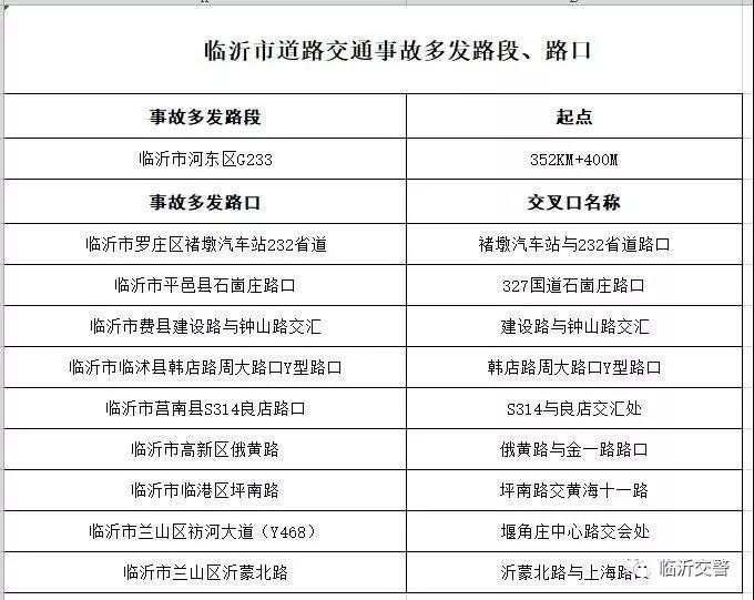为了保障道路交通通行顺畅,近期,临沂市公安局交警支队对全市重点交通事故隐患和危险路段进行排查,梳理出十大事故多发路段、路口,提醒广大驾驶人行经下列路段、路口时,注意观察路面情况,按照路段标志、标线以及规定速度通行,确保出行安全。