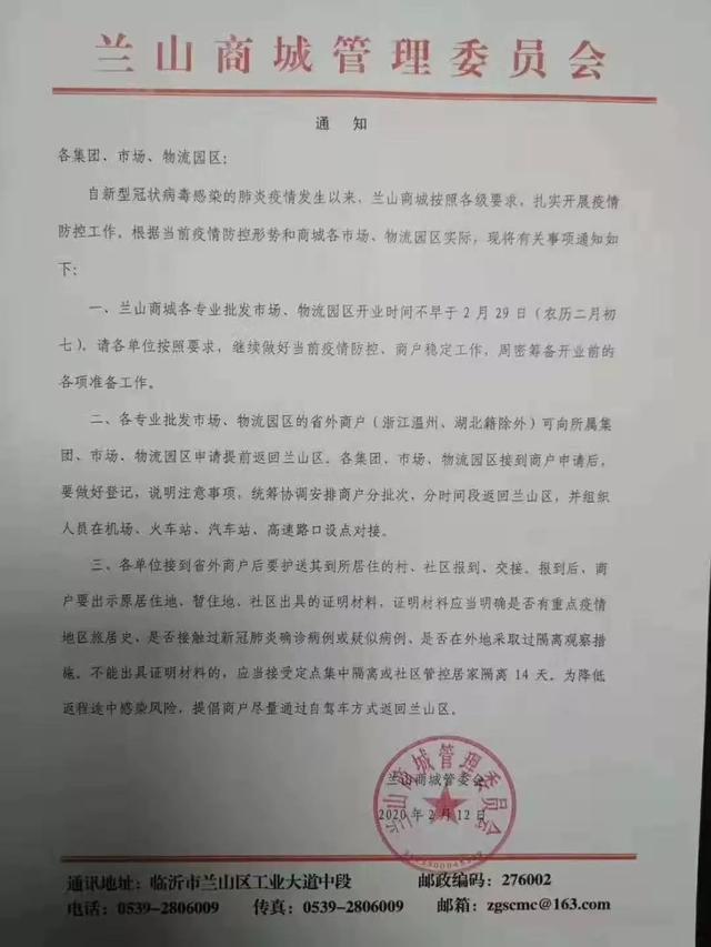 一、兰山商城各专业批发市场、物流园区开业时间不早于2月29日(农历二月初七)。请各单位按照要求,继续做好当前疫情防控、商户稳定工作,周密筹备开业前的各项准备工作。