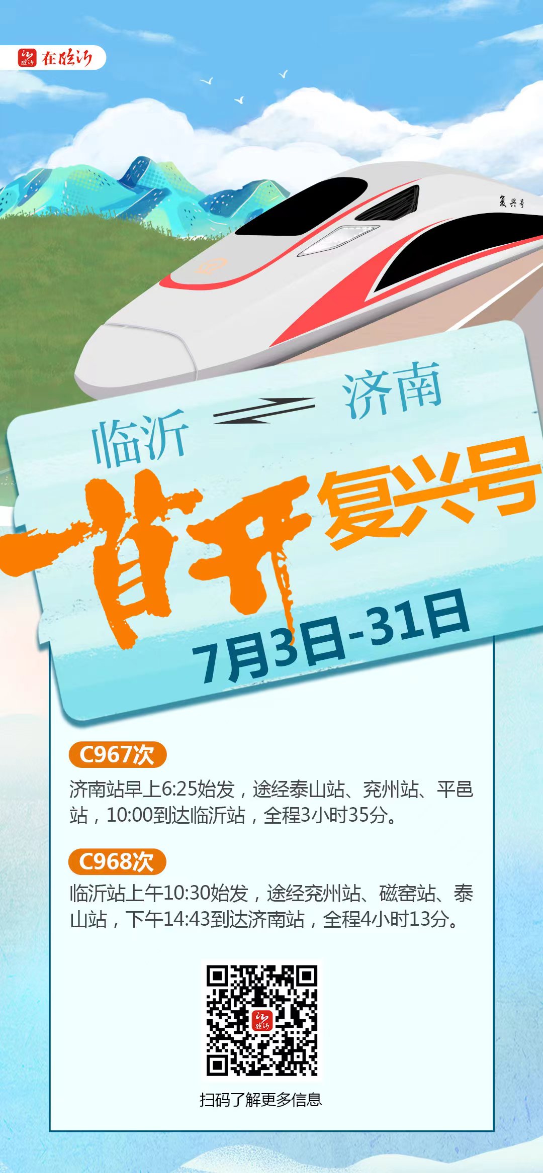 沂蒙新闻网讯 为满足临沂、济南两地旅客暑运期间出行需求,7月3日至31日临沂至济南间加开C967、C968次复兴号动车组1对,这也是临沂站首趟开往济南站的复兴号动车组。