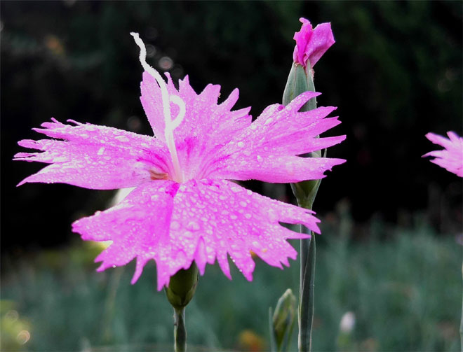 石竹花因其茎具节,膨大似竹,故名。石竹花是石竹科,多年生草本植物,为我国传统名花之一。石竹花种类较多,花色鲜艳,绚丽多彩。石竹有吸收二氧化硫和氯气的本领,凡有毒气的地方可以多种,防止污染。根和全草入药,清热利尿,破血通经,散瘀消肿。(高军 摄影)