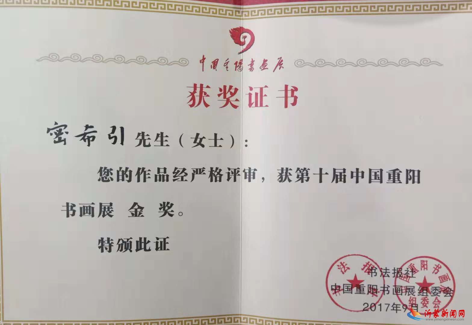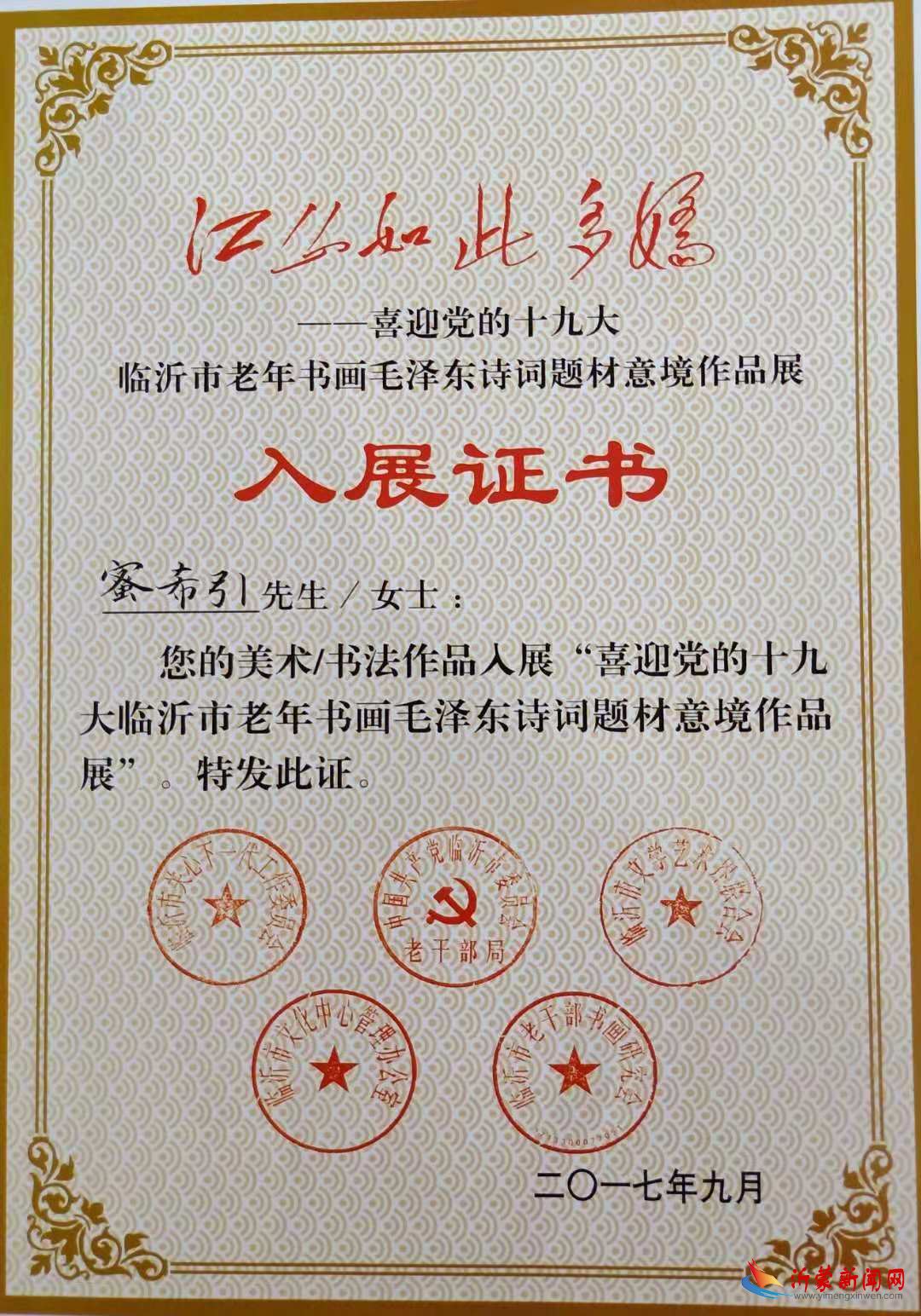 密希引,文羲斋主人,字致远,男,1955年11月生,。现为中国老年书画研究会会员,临沂市书协会员,市兰亭书画院副院长,河东区老年书画家协会副主席兼秘书长,书协副主席兼秘书长。釋佛寺书画院名誉院长。 - 密希引自幼酷爱书法艺术,笔耕不辍。几十年来,无论是忙还是闲,无论是课间,还是训练间隙,无论是劳动间歇,还是工作之余都坚持学习。离岗,退休后用十几年的时间,拜书法报兰干武总编、中国书协会员薛永维老师、刘大海老师、徐彦江老师为师。较为系统地学习书法史,书法理论,研究书法技法。书法学习以欧体楷书,二王行书为主,草书以临书谱为主,故书艺渐长。 - 作品曾在全国老年纪念抗战70周年获银奖,第九届老年重阳节书画展中获金奖。全国万福杯书画展入展,第十五届临沂书圣节临摹和创新书画展入展,在全市老干部建党九十周年书画精品大奖比赛中参赛作品荣获一等奖,在首届(2013)全国中老年书画大赛中荣获最佳入围奖等。
