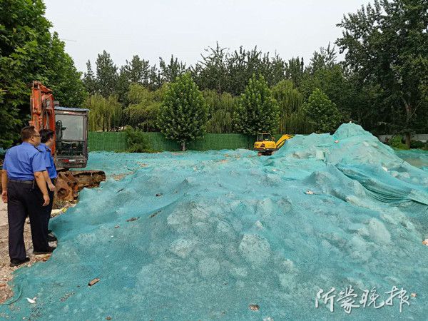 8月21日,御碑街社区城管人员在检查辖区沂州路一处幼儿园工地覆盖情况。