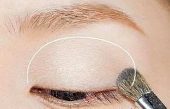 用眼影刷蘸取杏色眼影,顺着眼窝的轮廓轻轻刷满。