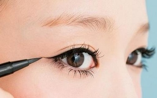 选择眼线液笔,沿着睫毛根部勾画眼线,沿着眼型的走向延长眼尾。