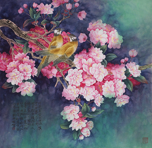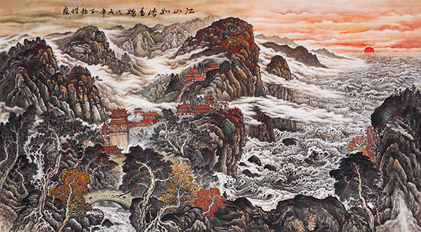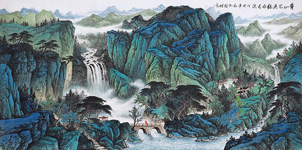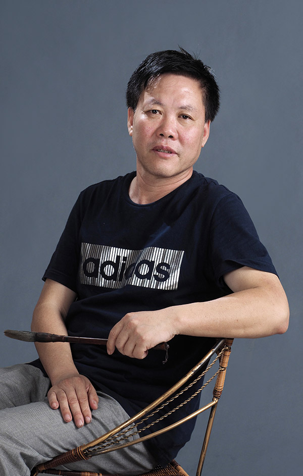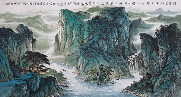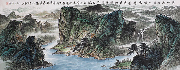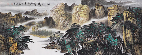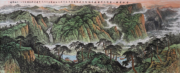 除人物画创除外,他还兼涉山水画创作,有坚实的造型功力,不只是指他写实技巧的高明,而主要是指他不凡的笔墨造型能力他对中国画的笔墨造型理解得很深刻,他在笔墨上深有造诣,深知笔墨语言是传统中国画的精髓,是为整个画面意境服务的。他的笔墨中有景、有情、有趣、有思。他笔下的山、水、树木,他勾画的每一幅画面,都是从形出发去寄情的,他认为作为艺术家,他的天职就是劳动和创造,就是永无休止地寻找和发掘,在自然中,在自己的内心中。如果一个人只有技术性劳动的熟练,没有丰富想象力与创造性的投入,那只能是手工匠师,而不能成为艺术家。丰富的想象与别出心裁的创造,来自于画家深厚的生活体验与全面的艺术修养,这就是人们经常说的“功夫在画外”的道理。有了功力、修养之后,绘画创作要再上一个层次,便要讲究品格了。。在艺术实践中,品格无所不在,反映在造型功力与艺术构思的方方面面。尤其在中国画创作中,品格更为重要,因为中国画是笔墨的艺术,以书法为基础的笔墨造型,最能反映创作者内在的精神品格。他从传统仿古山水中吸取养分,虽尚未挣脱古法,然其笔致之遒丽华峭,自有——番脱尘风致。而其功力与苦学之覃思,也自使人油然生佩。想来,于转移多师之际,自有鱼龙化变之造境。