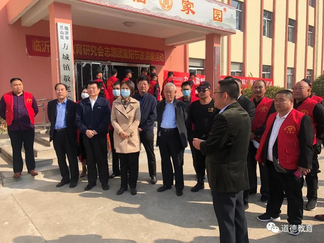 人间重晚晴,爱暖老人心,金风送爽,又逢重阳。在九九重阳节之际,临沂道德教育研究会志愿团走进方城镇敬老院,为老人送上节日慰问及祝福。出席此次活动的领导有临沂市人大副主任冯安;临沂道德教育研究会名誉会长、临沂高级技术学院党委原书记冯增田;临沂道德教育研究会《临沂道德教育》会刊主编、市纪委纠风办原主任陈社玉;临沂道德教育研究会秘书长、临沂亚美铝业董事长王现友;临沂市政府接待办党委原副书记汤友盛以及临沂道德教育研究会志愿团的志愿者、媒体朋友们出席了此次志愿活动。活动由兰山区政府副区长王翠宝主持。
